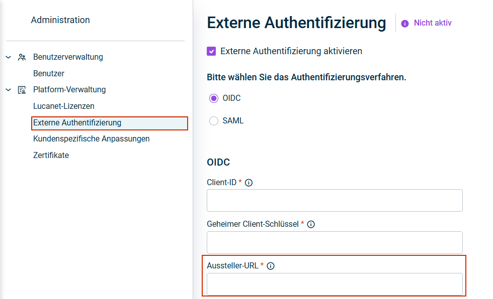 Nachdem Sie die Unternehmensanwendung und Single Sign-On in Azure/Microsoft Entra ID konfiguriert haben, müssen Sie bestimmte Authentifizierungsparameter kopieren und der Lucanet CFO Solution Platform hinzufügen, um die Einrichtung der externen Authentifizierung abzuschließen.