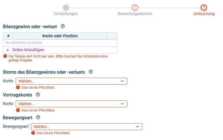 Geben Sie im Schritt Umbuchung die Konten an, die bei der Umbuchung des Periodenergebnisses des Vorjahrs berücksichtigt werden sollen.