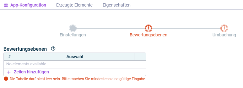 - Solange ein Schritt noch nicht vollständig konfiguriert wurde und/oder Konfigurationsfehler vorliegen, wird er mit einem roten Ausrufezeichen