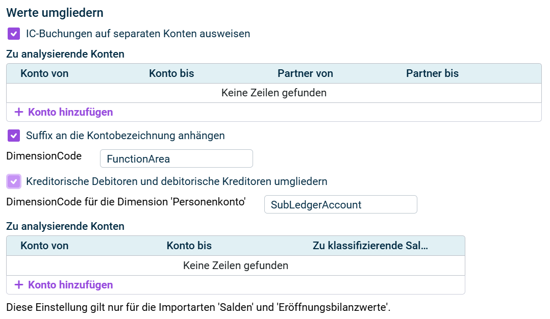 Umgliederung von Soll- oder Haben-Salden beim Import von Salden oder Eröffnungsbilanzwerten.