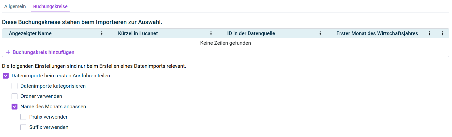 Auf dem Reiter Buchungskreise werden die Buchungskreise definiert, die beim Import der Daten zur Auswahl stehen sollen. Die Konfiguration entspricht der Konfiguration bei Datenquellen vom Typ Lucanet.Financial Warehouse (#2068). Für die vollständige Beschreibung aller Optionen siehe Buchungskreise angeben.
