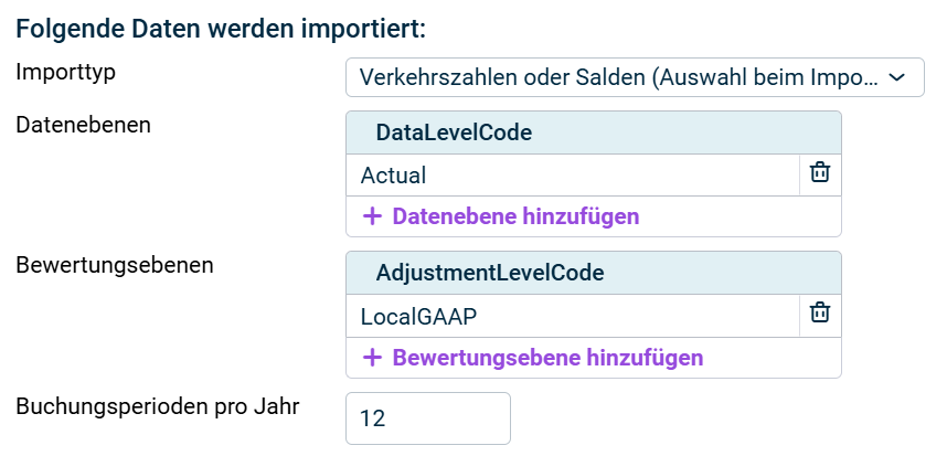 - Geben Sie eine höhere Zahl als 12 an, werden alle über 12 hinausgehenden Perioden standardmäßig in die Periode 12 importiert. Optional können Sie angeben, ob die weiteren Perioden mit einem Suffix in separate Bewertungsebenen importiert werden sollen.