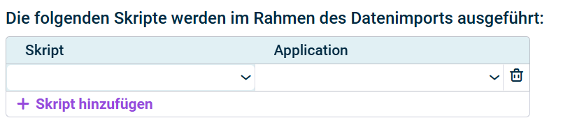 Skripte, die beim Datenimport ausgeführt werden sollen. Es sind alle Skripte aus dem Arbeitsbereich Skripte wählbar.