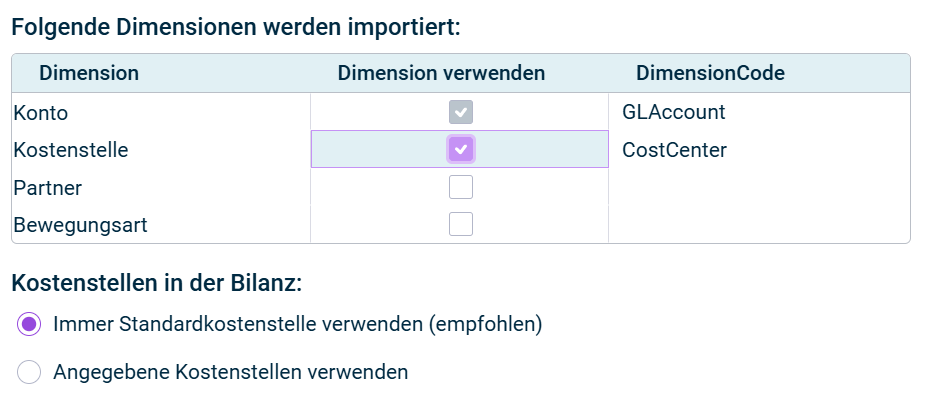 Geben Sie an, welche Dimensionen importiert werden sollen. Die Dimension Konto ist immer aktiviert. Ändern Sie ggf. in der Spalte DimensionCode den angezeigten Dimensions-Code.