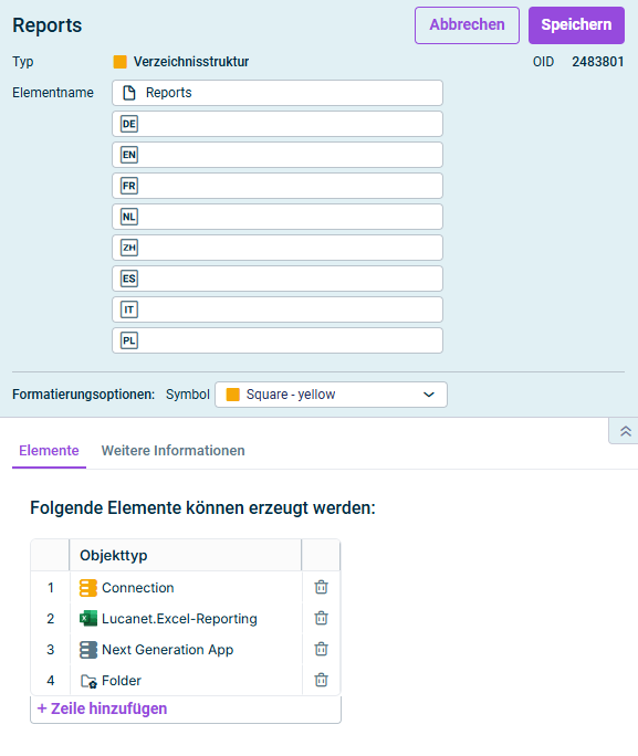 Definieren Sie anschließend auf dem Reiter Elemente, welche Elemente in der Verzeichnisstruktur angelegt werden können. Die verfügbaren Objekttypen sind im folgenden Abschnitt beschrieben.