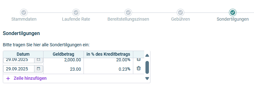 - Sondertilgungen – die über die im Kreditvertrag vereinbarten laufenden Raten hinausgehen