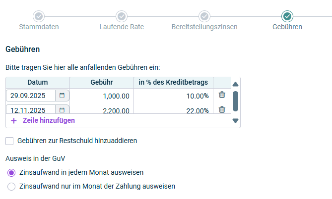 - Zinsaufwand in jedem Monat ausweisen, wenn die Gebühren gleichmäßig verteilt in jedem Monat der Kreditlaufzeit ausgewiesen werden sollen.