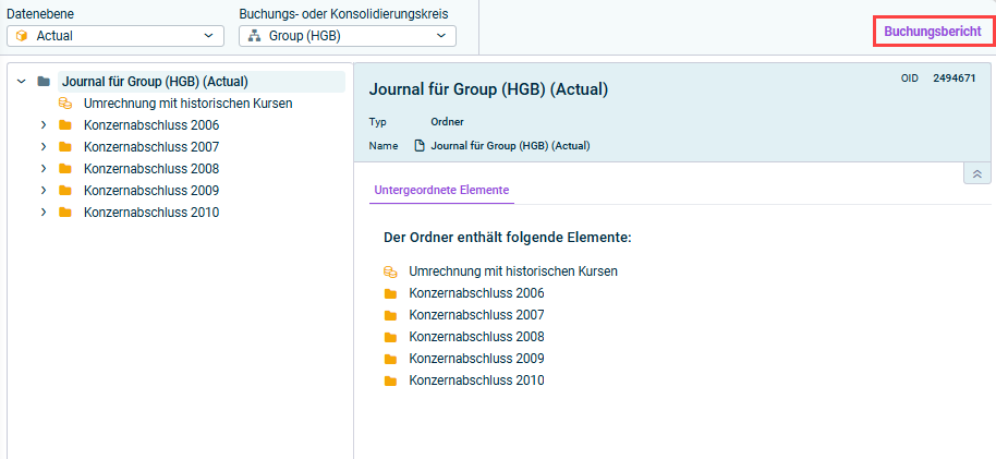 - Wählen Sie im Arbeitsbereich Journale die Datenebene und den Buchungskreis oder Konsolidierungskreis, für den Sie den Bericht erstellen möchten, und klicken Sie oben rechts auf Buchungsbericht: