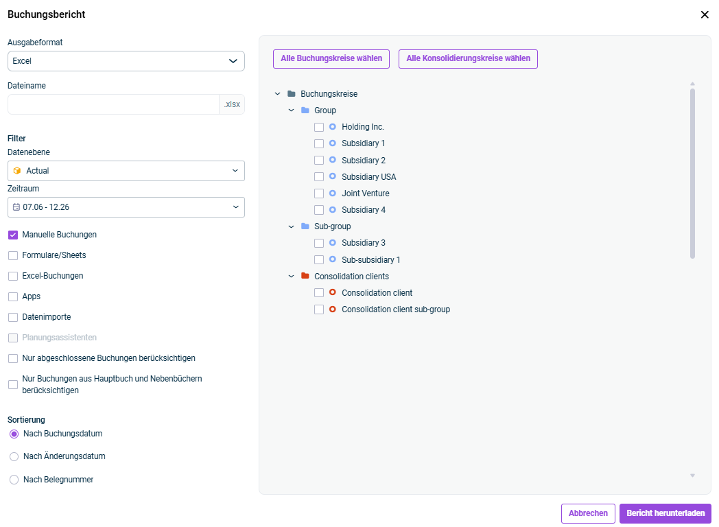 In Lucanet Consolidation & Financial Planning können Sie einen Buchungsbericht erstellen und herunterladen, um Buchungsdaten zu analysieren, zu prüfen und weiterzugeben. Sie können für den Bericht Folgendes festlegen: