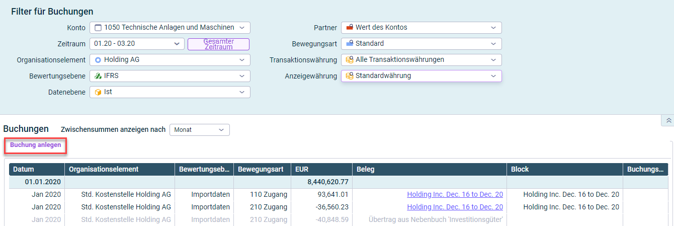 - Zu jedem Wert werden alle Buchungen, das Buchungsdatum und die dazugehörenden Belege angezeigt.
