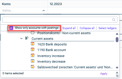 Sie können sich für die Auswahl nur die Konten anzeigen lassen, die Buchungen enthalten, indem Sie in die Dropdown-Liste in der Spalte Konto klicken und die Option Nur Konten mit Buchungen anzeigen aktivieren: