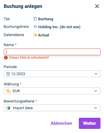 Dialog 'Buchung anlegen' - Geben Sie den Namen des Elements an.