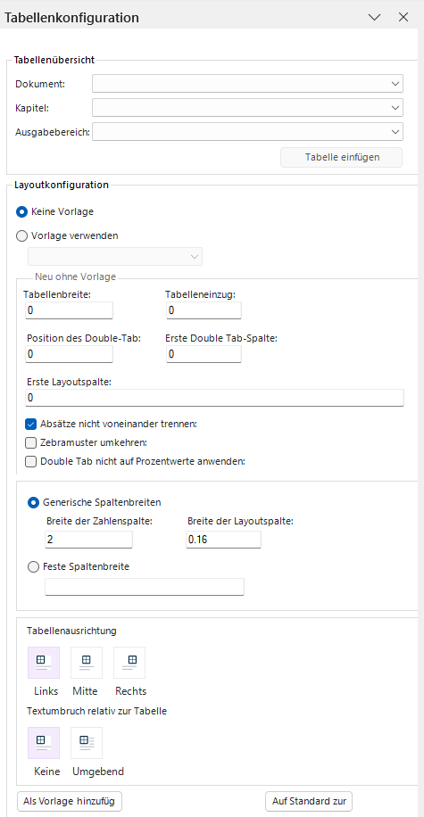 Die folgenden Optionen sind im Dialog Tabellenkonfiguration im Bereich Layoutkonfiguration verfügbar: