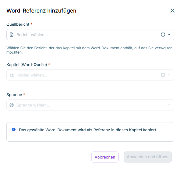 Eine Word-Referenz legen Sie im Cockpit über das Drei-Punkte-Symbol eines leeren Kapitels an.