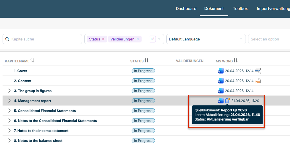 Wenn das Quellkapitel einer Word-Referenz aktualisiert wird, wird im Cockpit das Referenzsymbol in der Spalte MS Word markiert. Außerdem zeigt ein Tooltipp bei Status den Hinweis Aktualisierung verfügbar an: