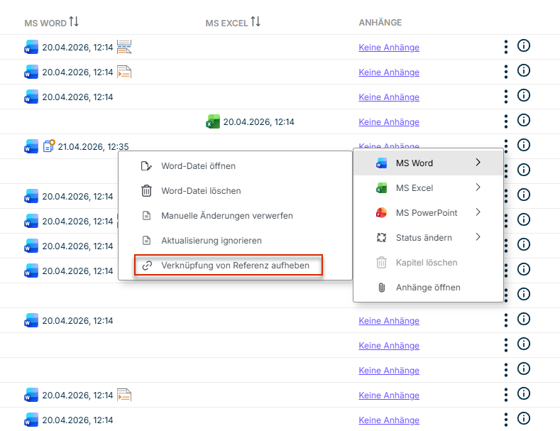 Sie können die Verknüpfung einer Word-Referenz zum Originalkapitel jederzeit aufheben.