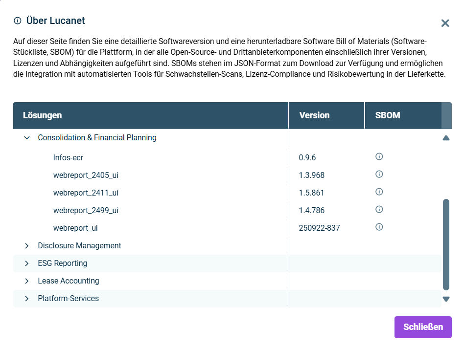 Die Lucanet CFO Solution Platform bietet eine umfassende Software-Stückliste (SBOM), um Sicherheit, Transparenz und Compliance zu verbessern. Diese Informationen stehen ausschließlich Administratoren über die Option Über Lucanet im Hauptmenü zur Verfügung.