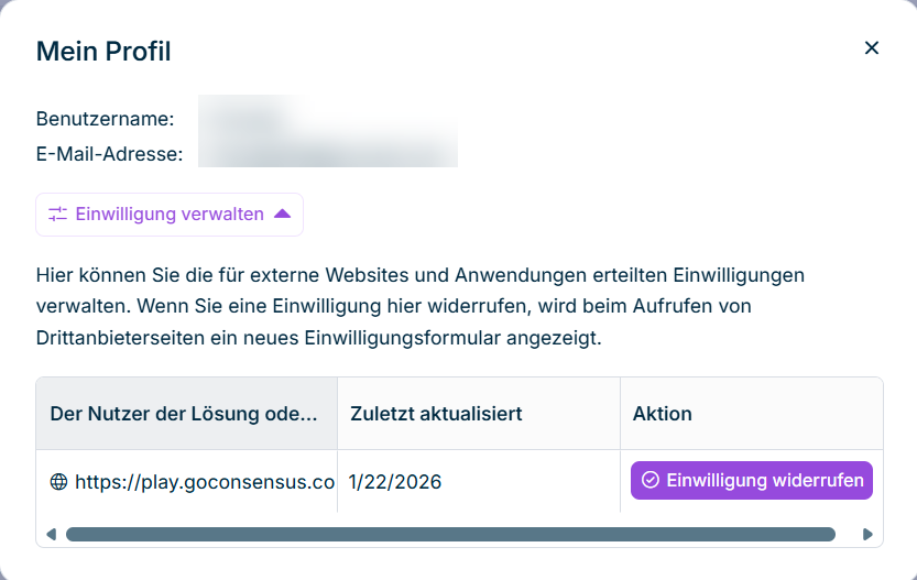 - Aktion: Schaltfläche zum Widerrufen der Einwilligung. Nach dem Widerruf einer Einwilligung wird der Einwilligungsdialog beim nächsten Zugriff auf den Dienst erneut angezeigt.