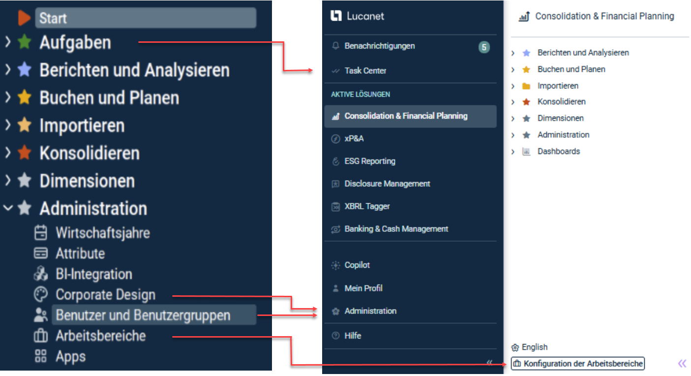 | Die Arbeitsbereiche wurden im Ordner Administration im Arbeitsbereich Arbeitsbereiche konfiguriert. | Die Arbeitsbereiche werden unter Konfiguration der Arbeitsbereiche am unteren Rand der Strukturansicht der Lösung Consolidation & FInancial Planning konfiguriert. |