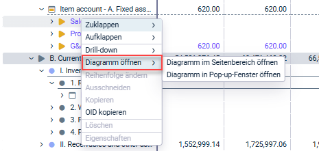 Funtkion 'Exportieren' - Die Funktion Diagramm öffnen, die zuvor über das Symbol Detailansicht anzeigen aufgerufen wurde, ist nun über einen Rechtsklick auf Elemente oder Konten in Büchern und Spiegeln verfügbar: