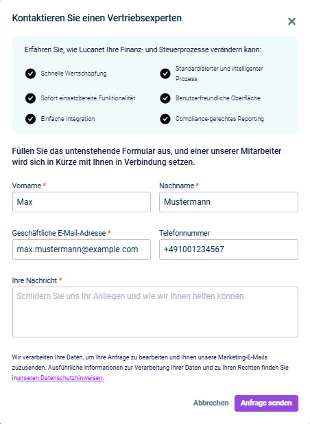 Auf jeder Demoseite können Sie auf die Schaltfläche Einen Experten kontaktieren klicken, um Unterstützung anzufordern oder weitere Informationen zu nicht lizenzierten Lösungen zu erhalten. Ein Kontaktformular wird z. B. wie folgt angezeigt: