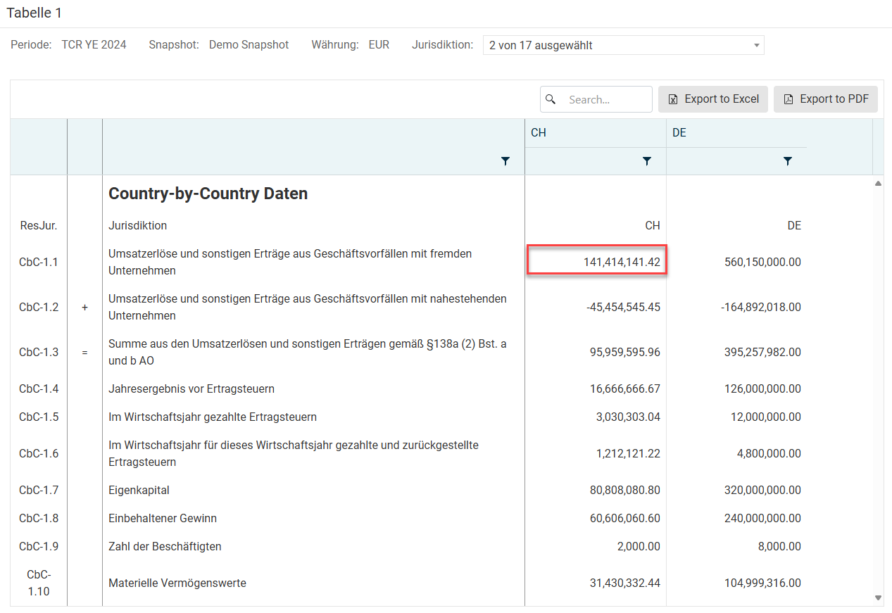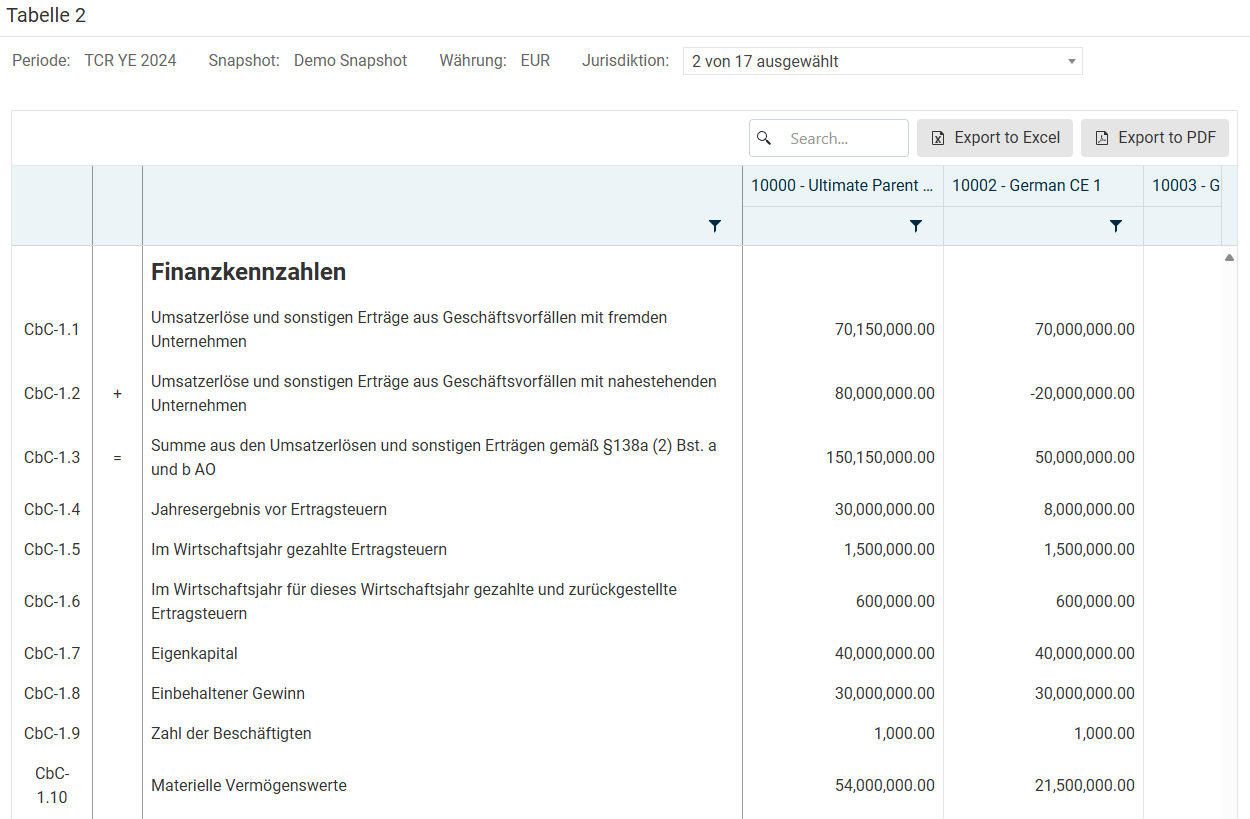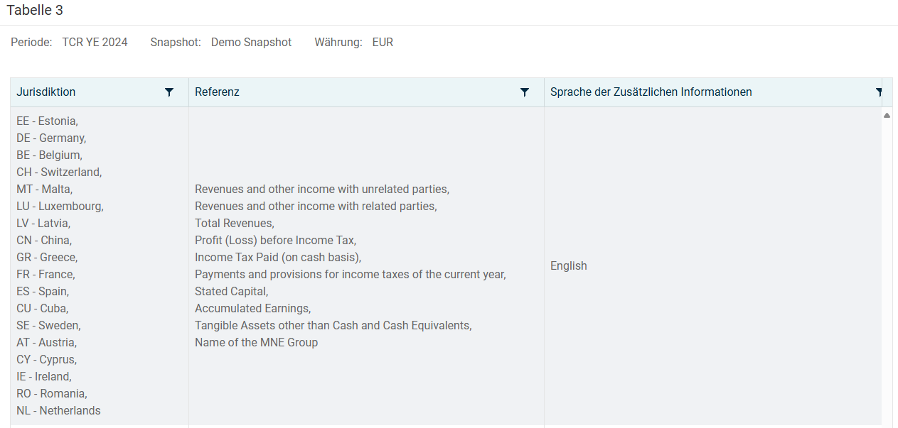 Der Arbeitsbereich zeigt anschließend die Country-by-Country-Daten für alle CEs an, die für die Zwecke des CbCR in den ausgewählten Jurisdiktionen ansässig sind. Alle Werte in diesem Arbeitsbereich werden dabei in der Währung des Snapshots angezeigt.