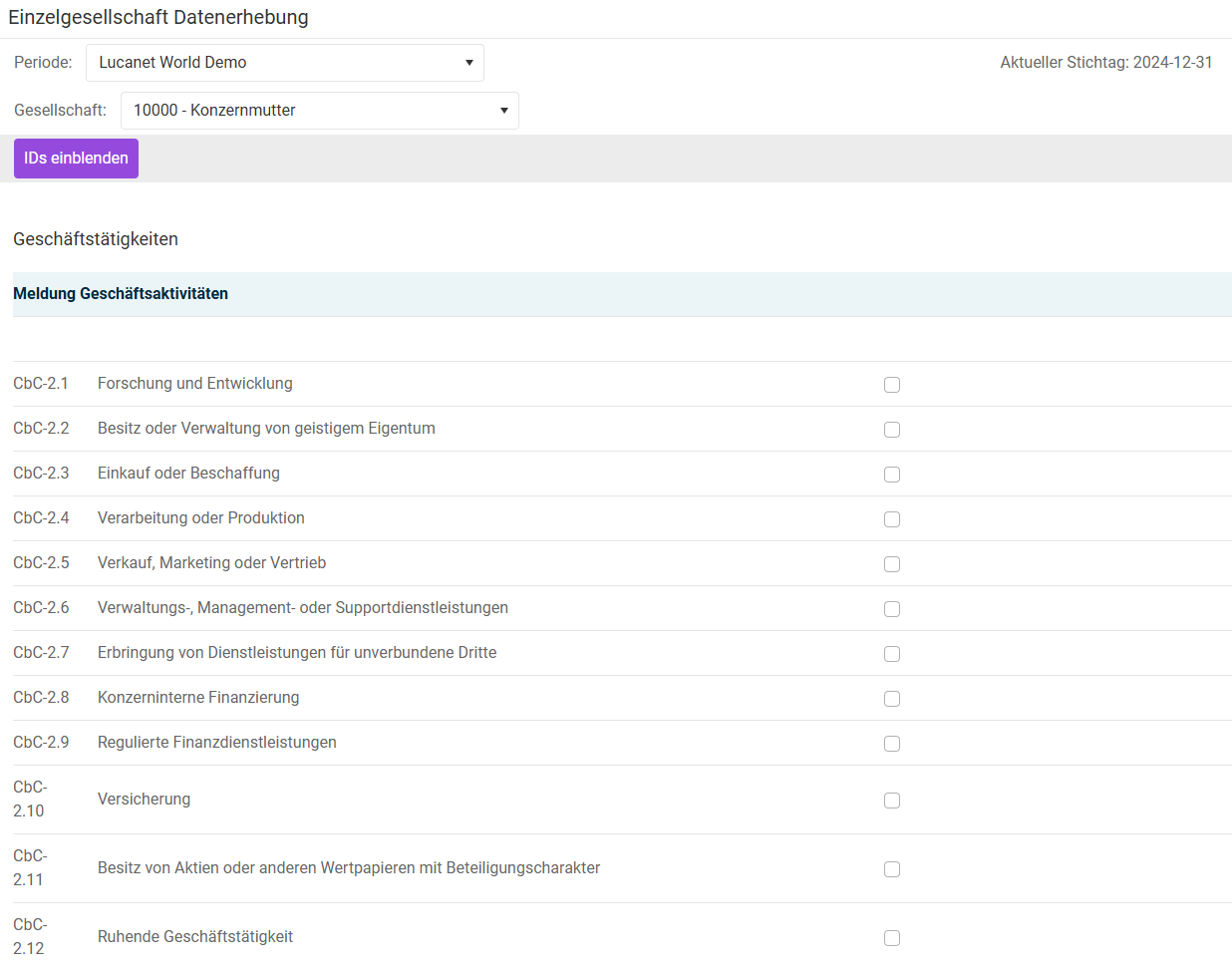 Der Ordner Geschäftstätigkeiten befindet sich unter Country-by-Country Reporting | Entity Data Collection und wird wie folgt angezeigt: