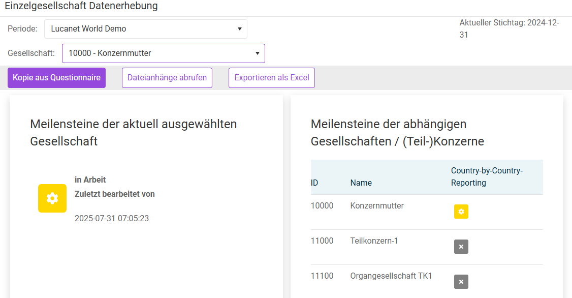 Der Arbeitsbereich Home der Einzelgesellschaft Datenerhebung zeigt den Status des Meilensteins der gewählten Gesellschaft sowie den Status der Meilensteine aller abhängigen Gesellschaften und der Gesellschaften im selben Teilkonzern. Benutzer mit den entsprechenden Rechten können auch den Status eines einzelnen Meilensteins ändern, indem sie darauf klicken.