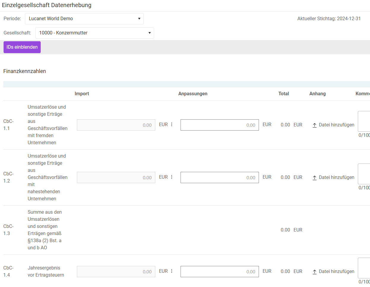 Im Arbeitsbereich Finanzkennzahlen, können Sie die Finanzdaten für den CbC-Bericht auf Geschäftsebene sammeln.