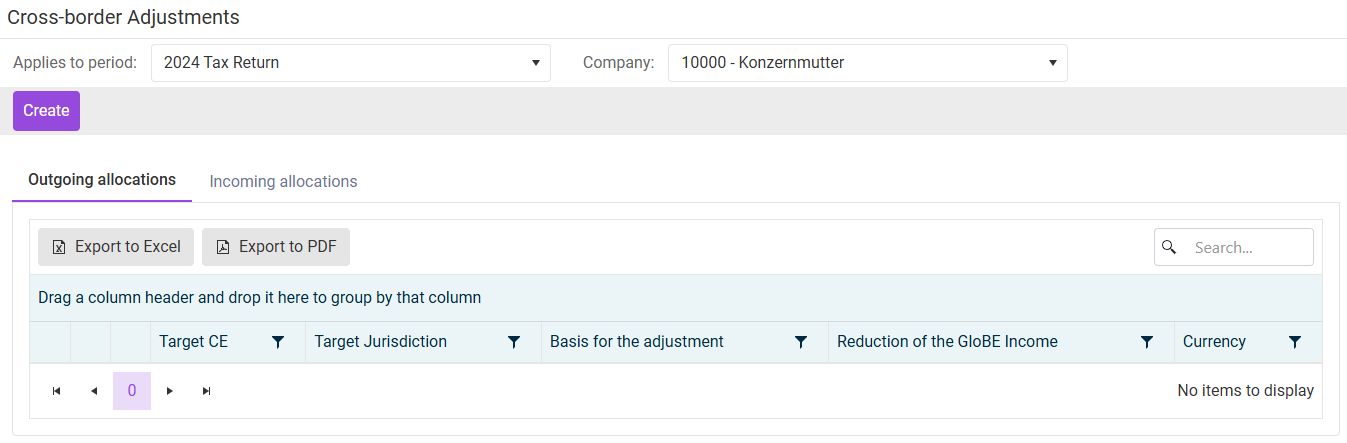 Der Arbeitsbereich Cross-border Adjustments befindet sich unter Pillar 2 | Entity Data Collection | Cross-border Adjustments. Der Arbeitsbereich wird z. B. wie folgt angezeigt: