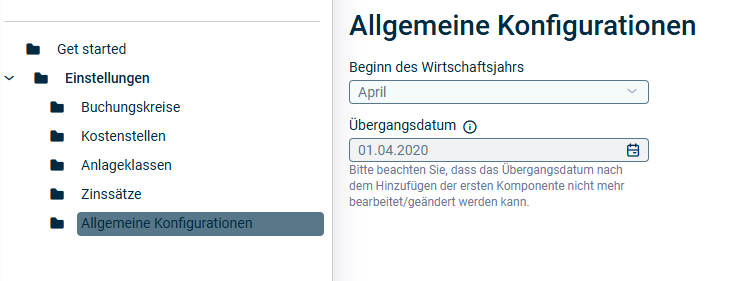 Die Felder Beginn des Wirtschaftsjahrs und Übergangsdatum werden deaktiviert und können nicht geändert werden, sobald die erste Komponente erstellt wurde.