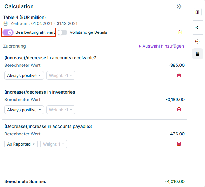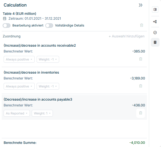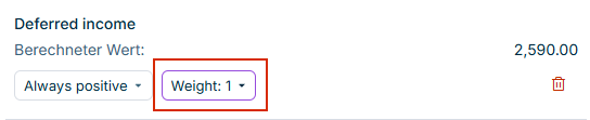 Klicken Sie ggf. auf die Dropdown-Liste unter Berechneter Wert, um das Vorzeichen zu ändern (z. B., ob ein Summand zum Gesamtwert addiert oder davon subtrahiert wird). Folgende Möglichkeiten sind in der Dropdown-Liste verfügbar: