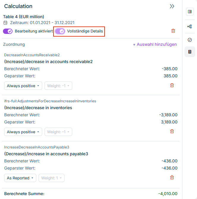Aktivieren Sie ggf. in der Berechnungsansicht die Option Vollständige Details, um zusätzliche technische Informationen zu jedem Summanden anzuzeigen.