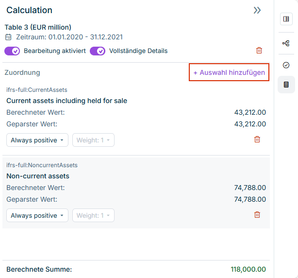 Mit der Berechnungsansicht hat der XBRL Tagger ein spezielles Seitenfenster, um: