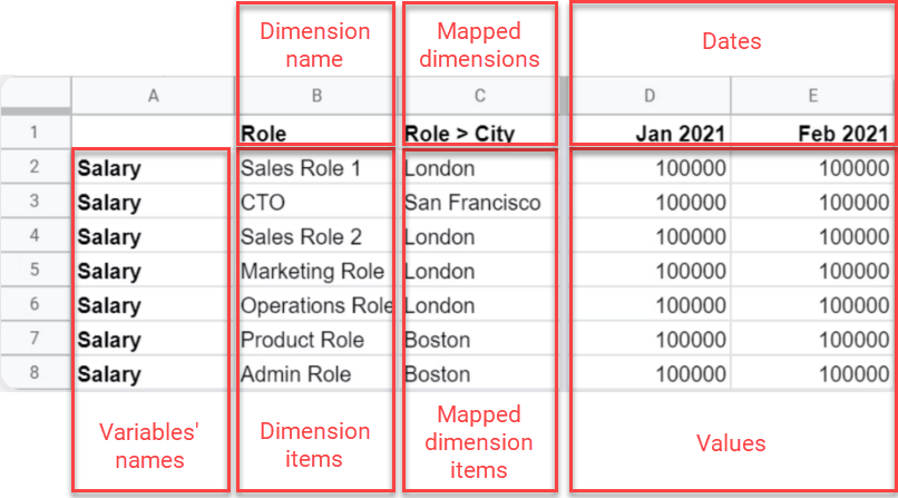 Hinweis: Sie können [dimension] oder [variable] zu einem Spaltennamen hinzufügen, um sicherzustellen, dass das System die Spalte korrekt erkennt. - Sie können auch Dimensionszuordnungen hinzufügen. In diesem Fall muss der Spaltenname den Namen der Dimension, von der zugeordnet wird, und den Namen der Dimension, auf die zugeordnet wird, in folgendem Format enthalten: [von Dimension] > [zu Dimension].