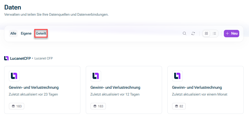 Sie können alle Verbindungen und Datenquellen, die mit Ihnen geteilt wurden, im Arbeitsbereich Daten auf dem Reiter Geteilt anzeigen.
