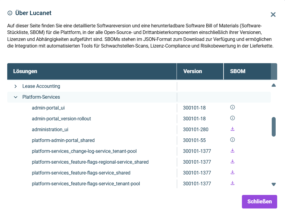 Wir haben den Dialog Über Lucanet optimiert und eine übersichtliche Struktur eingeführt, die Plattform‑ und Lösungsinformationen in drei Spalten darstellt: Lösungen, Version und SBOM (Software Bill of Materials). In der neuen Oberfläche können Sie die Versionsangaben zu Ihren lizenzierten Lösungen und zu den Plattformdiensten sowie zu deren untergeordneten Komponenten nun einfacher einsehen.