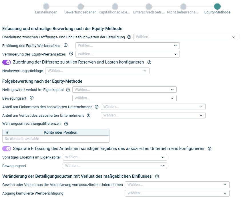 Die neue Funktion kann im Schritt Einstellungen auf der App-Oberfläche aktiviert werden. Die Konfiguration der Bewertung nach der Equity-Methode wird in dem daraufhin zusätzlich angezeigten Schritt Equity-Methode vorgenommen.