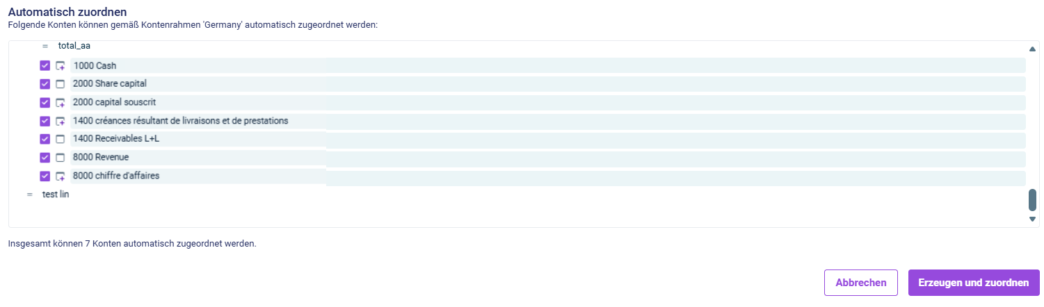 Beim Importieren von Daten in Buchungskreise haben Sie nun die Möglichkeit, importierte Konten automatisch auf der Grundlage eines Kontenrahmens zuzuordnen – vorausgesetzt, es ist mindestens ein Kontenrahmen in Lucanet.Financial Client vorhanden. Bei dieser Zuordnungsmethode werden in einem Dialog Zuordnungen innerhalb einer Kontenhierarchie vorgschlagen. Sie können einzelne Zuordnungsvorschläge über Kontrollkästchen annehmen oder ablehnen und die Zuordnung anschließend mit einem Klick bestätigen: