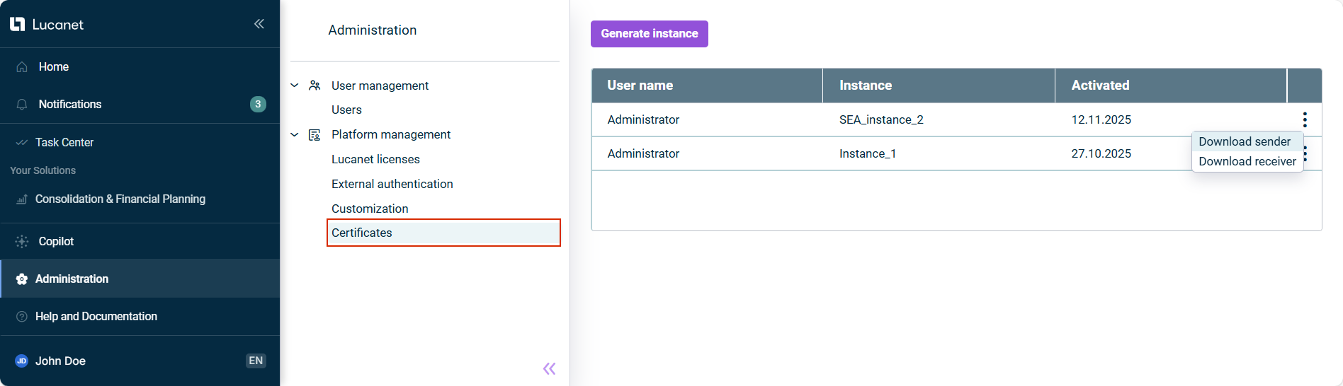 The Certificates workspace allows administrators to generate and download SEA certificates using instances. These certificates are used to install SEA in Lucanet.Software Manager and to configure SEA applications in Consolidation & Financial Planning solution of the Lucanet CFO Solution Platform.
