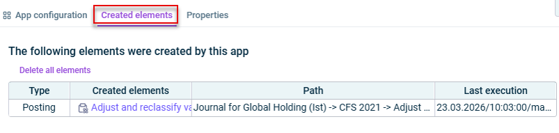On the Created elements tab, the postings that were created during the app execution are shown.