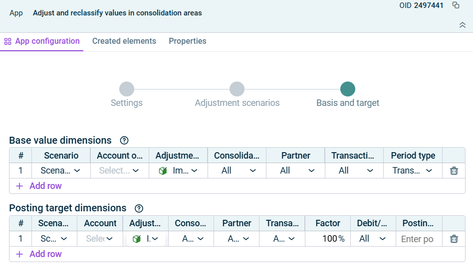 In the Basis and target step, specify the base value dimensions to be adjusted or reclassified as well as the posting target dimensions for each scenario.