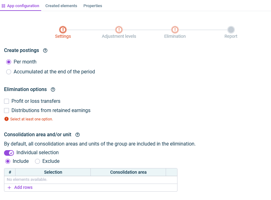 The app eliminates intercompany transactions in each month of the consolidation period and creates monthly elimination postings. - Accumulated at the end of the period