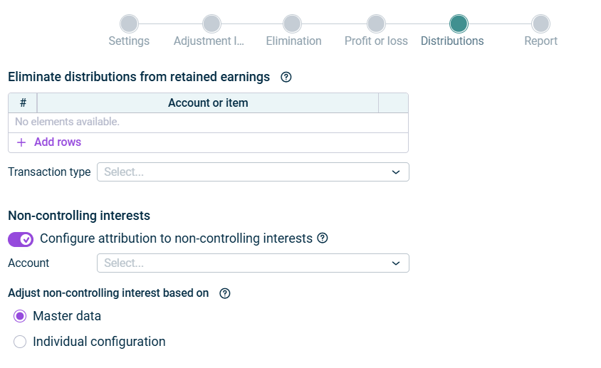 The Distributions step is only displayed if you chose Distributions from retained earnings as elimination option in the Settings step: