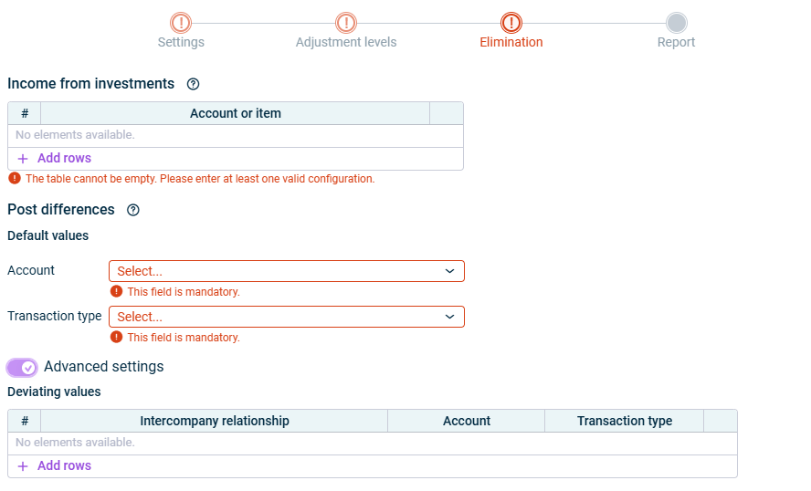 In the Adjustment levels step, specify the adjustment levels that should be taken into account for the elimination.