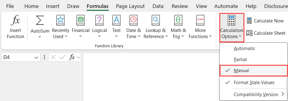 To do this, open the Formulas tab in the Excel ribbon and select the Manual option under Calculation Options: