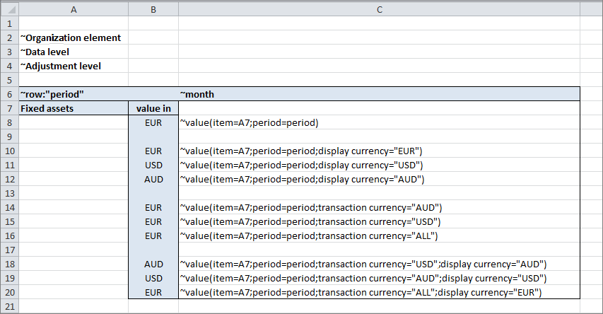 In the Excel worksheet, all options for querying the item Fixed assets are used. The Value in column displays the currency resulting from the tilde formula if the default currency of the selected organization element is EUR: