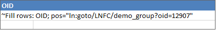 In ~Fill rows it is specified that the OIDs of the elements below the item with the URI ln:goto/LNFC/demo_group?oid=12907 are to be read into MS Excel: