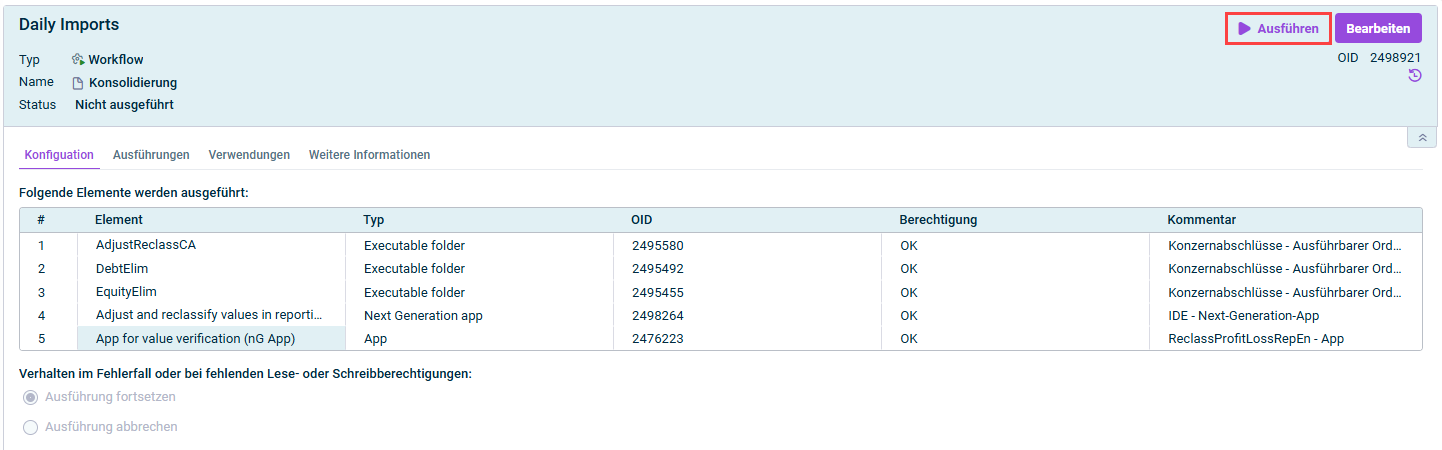 Data imports into reporting entities can only be executed within a workflow if it is an update of an existing import in which the configuration is kept unchanged. If the configuration of a data import is to be adjusted during execution, the data import must be executed as described under Creating and Executing the Data Import.