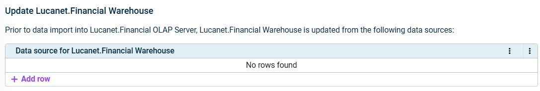 After creating a Lucanet.Financial Warehouse (#2068) data source, the settings for importing data from Lucanet.Financial Warehouse are configured in the detail view of the data source.